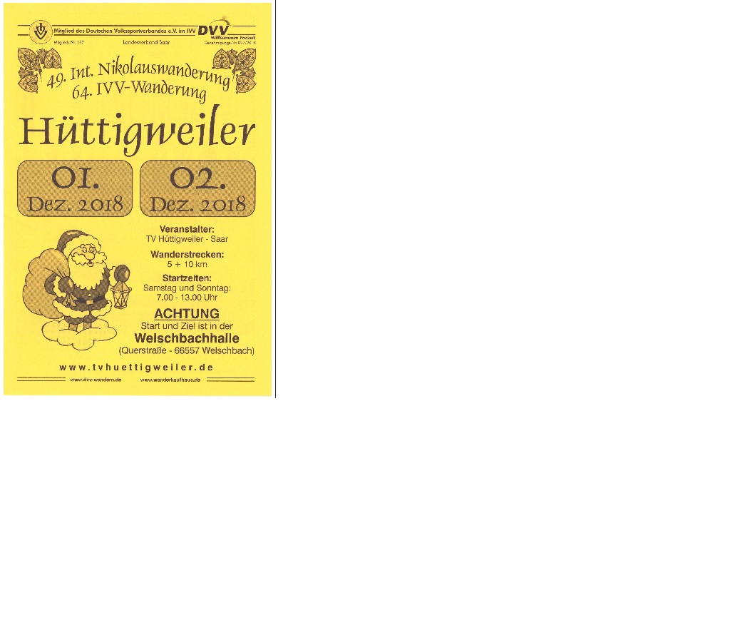 18. November 2018Nikolauswanderung 2018 Am 01./02. Dez. 2018 findet unsere 49. int. Nikolaus- und 64. IVV- Wanderung auch in diesem Jahr in der Welschbachhalle (Querstraße - Welschbach) statt.