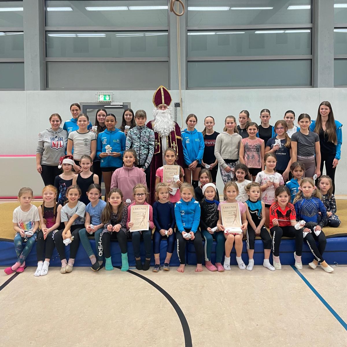 Ein besonderes Highlight der Feier war der Besuch des Nikolaus, der von den Kindern mit großer Begeisterung empfangen wurde. Gespannt lauschten sie seinen Worten und freuten sich über das kleine Lob für ihren Fleiß und ihre turnerischen Fortschritte im vergangenen Jahr. Außerdem sangen wir dem Nikolaus ein Weihnachtslied, was für eine besonders schöne Stimmung sorgte.